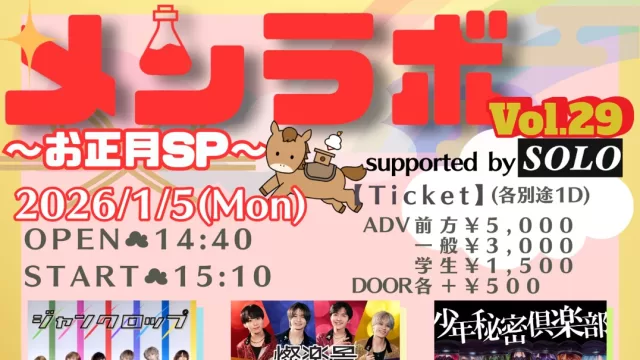 ライブ 1/5 赤羽ReNY alpha 1月5日(月)赤羽ReNY alpha 「メンラボ Vol.29-お正月SP-supported by SOLO-」 OPEN 14:40/START 15:10 前方 5000円/一般 3000円(D別) 学生 1500円(D別) 配信 ... 2026年01月05日 ライブ