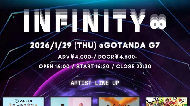 display 1/29 GOTANDA G7 『INFINITY∞』 🗓️2026年1月29日(木) 📍GOTANDA G7 ⏰OPEN 16:00 / START 16:30 🎤18:15~18:35 / 📸18:50~20:00 🎫前売 4000円/当日4500円(各D別) ✍️1... 2026年01月29日 displayライブ