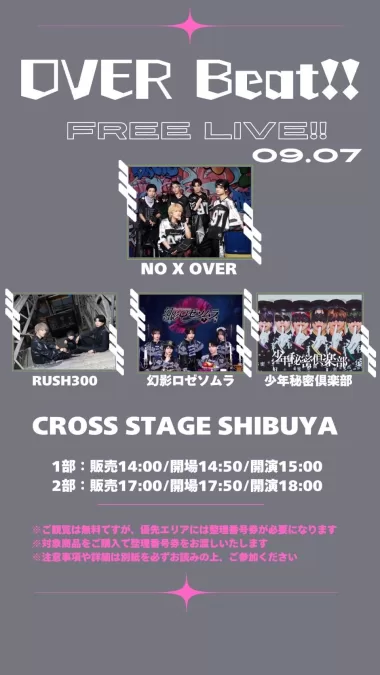 出演(順不同): NO X OVER / RUSH300 / 幻影ロゼソムラ / 少年秘密倶楽部