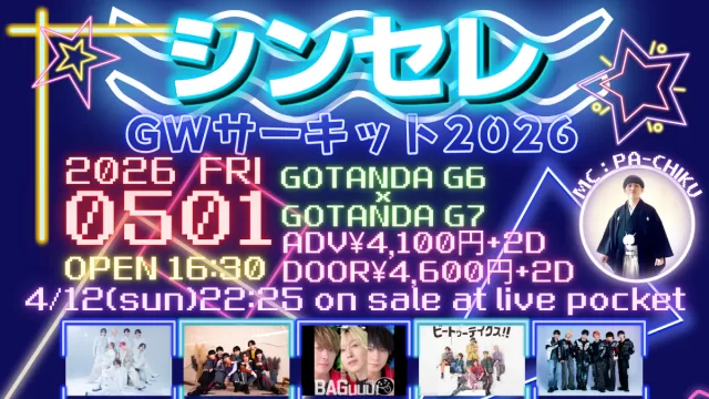 シンセレGWサーキット2026 5月1日(金) OPEN16:30 五反田G6×五反田G7 (2会場行き来自由のサーキットイベント) 前売り4,100円+2D 当日4,600円+2D 五反田G7🎤19:55~20:15/📷21:15~22:...