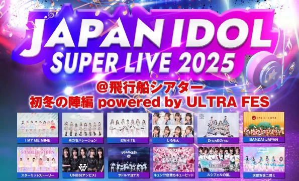 ライブ 12/7 飛行船シアター 公演名:「JAPAN IDOL SUPER LIVE 2025」@飛行船シアター 初冬の陣編 powered by ULTRA FES 公演日:12/7(日) 会 場:飛行船シアター 時 間:開場:10:00 開演:10:20(予定)※変更... 2025年12月07日 ライブ